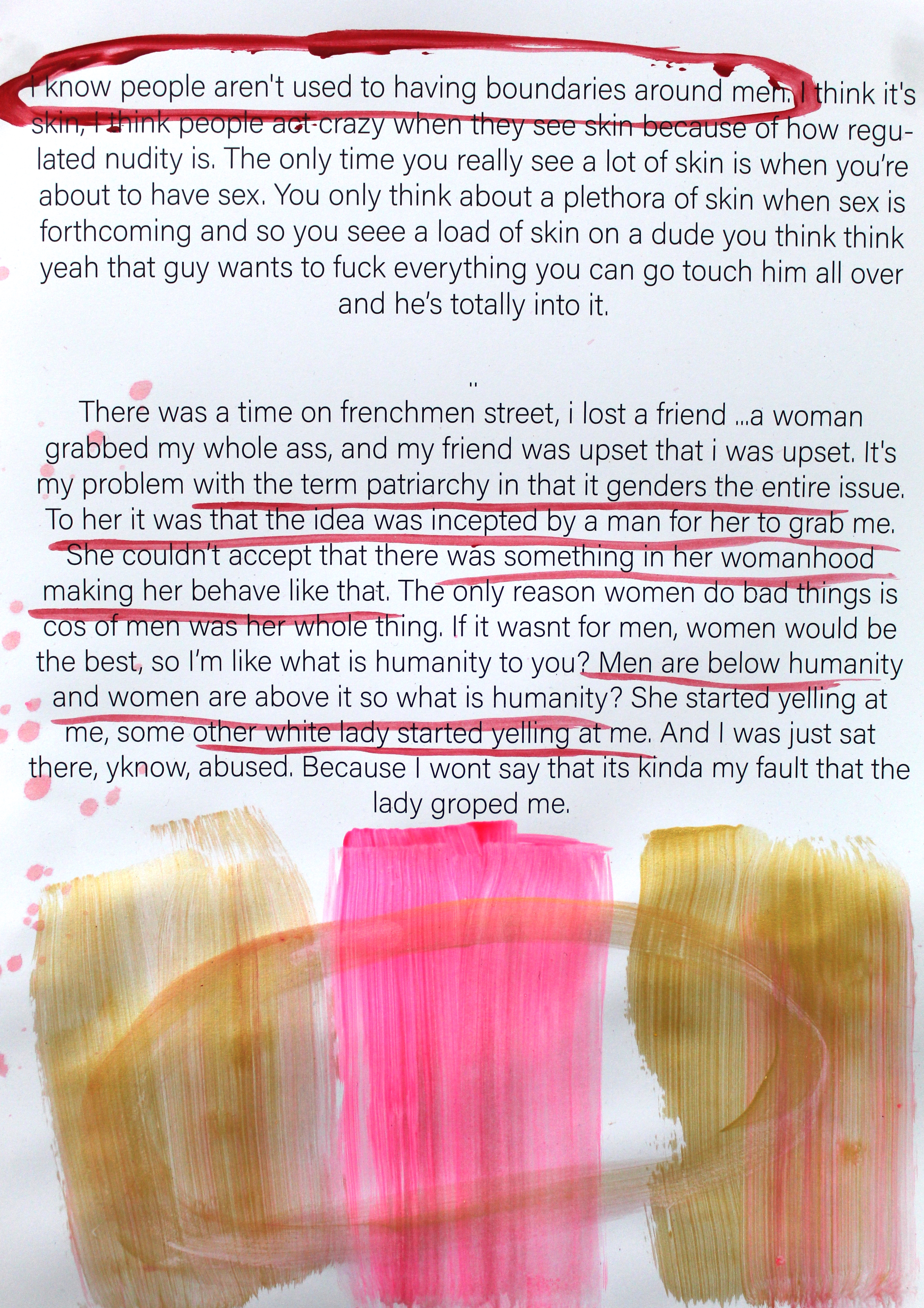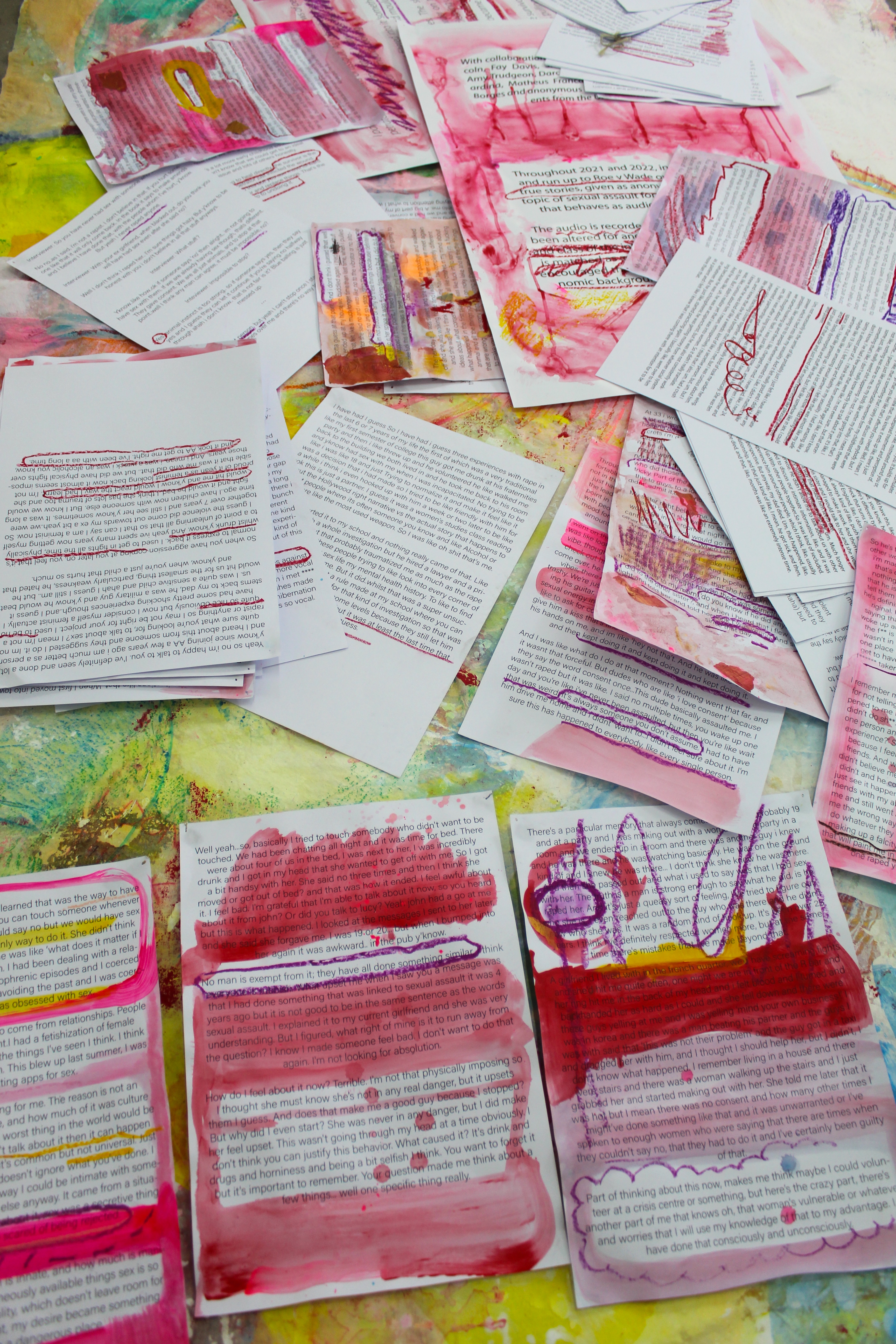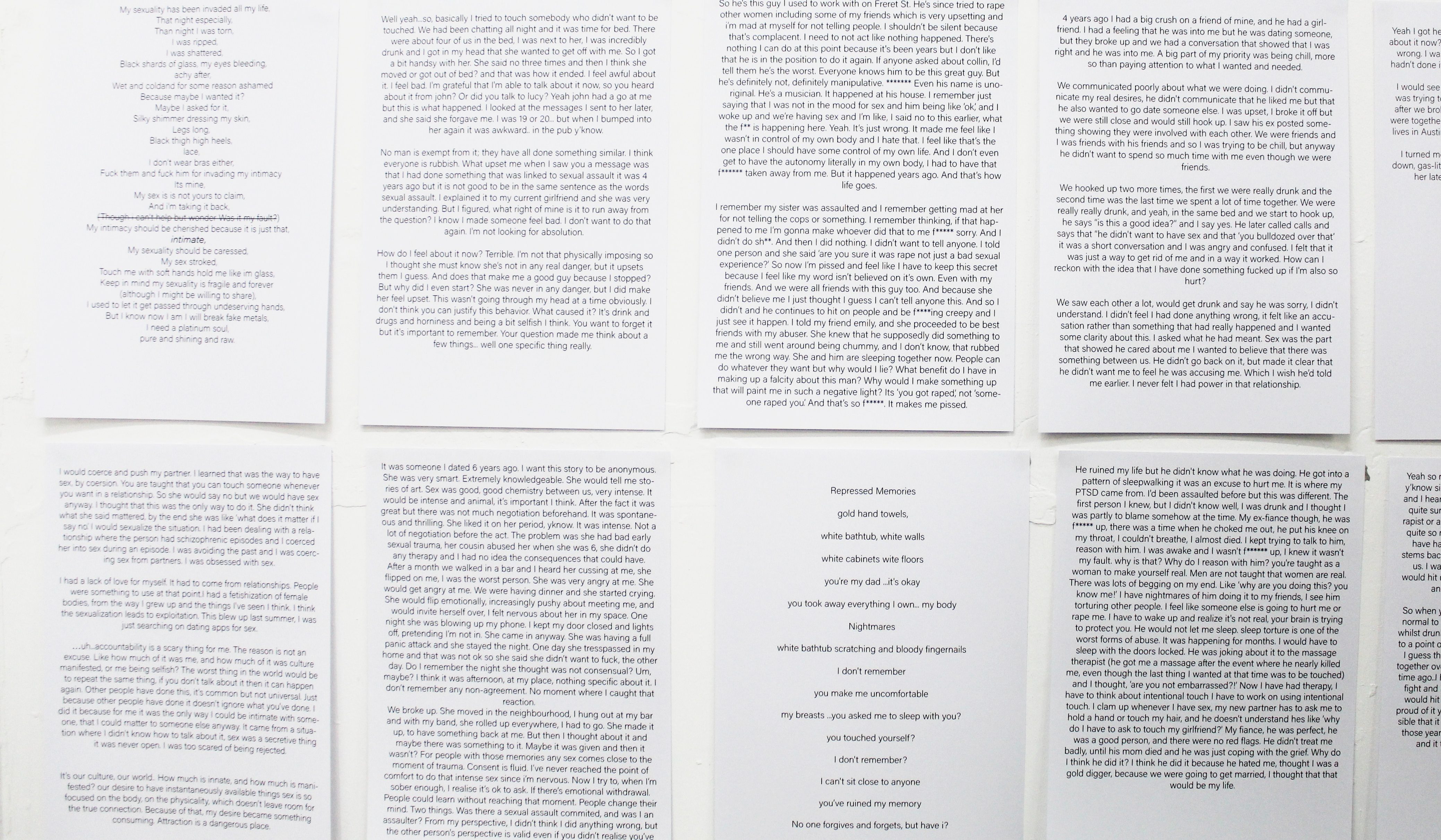 At it’s showing at GlogauAIR Berlin, verbal testimonies (recorded using actors) were played through ‘silent disco’ style headphones alongside two 9ft x 5ft double sided paintings which revealed snippets of the interviews that had been redacted after the end of the interview. 18 painted anonymous interviews and a video essay with over 50 pages of transcripts collected first hand explore the nuances of sexual trauma.