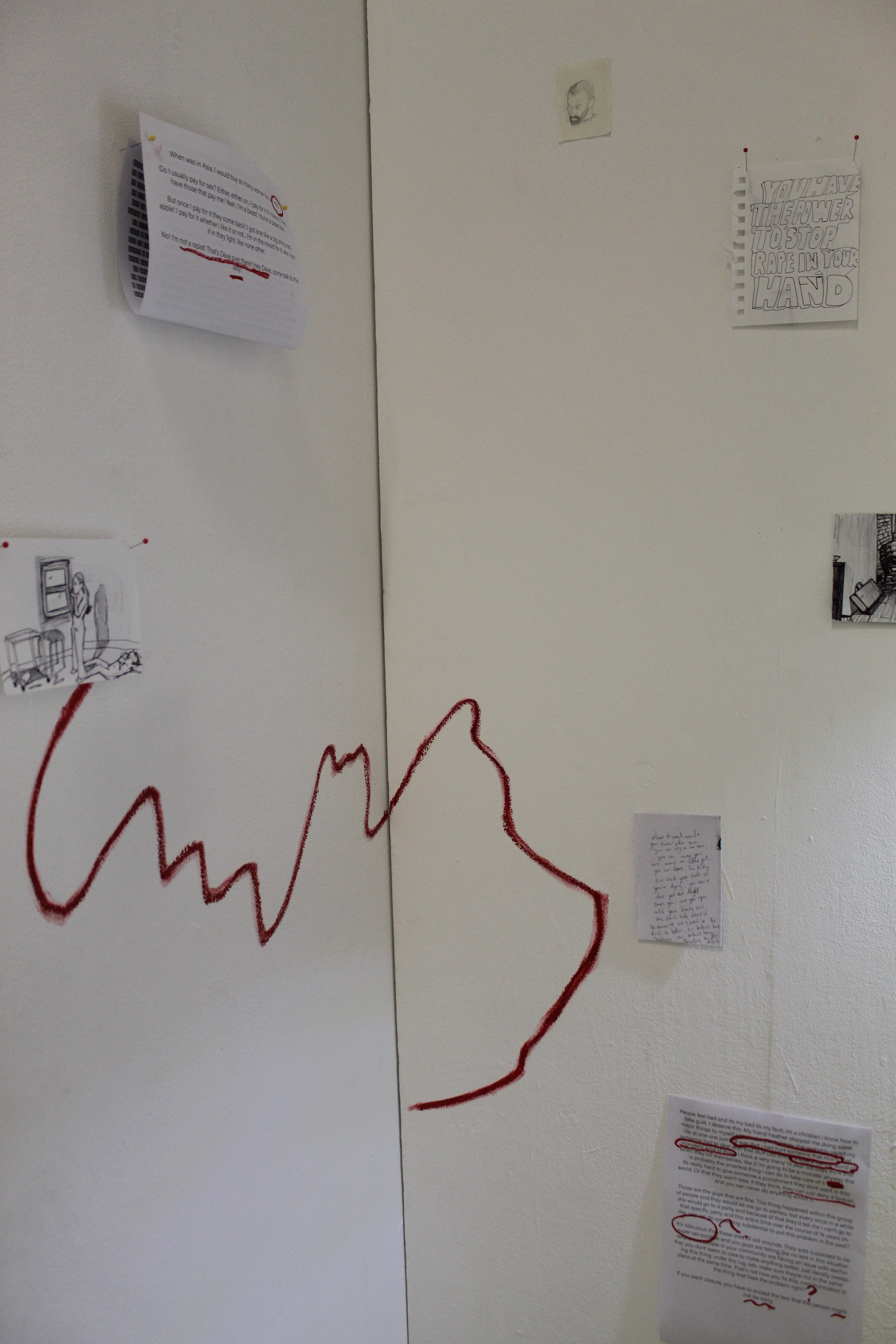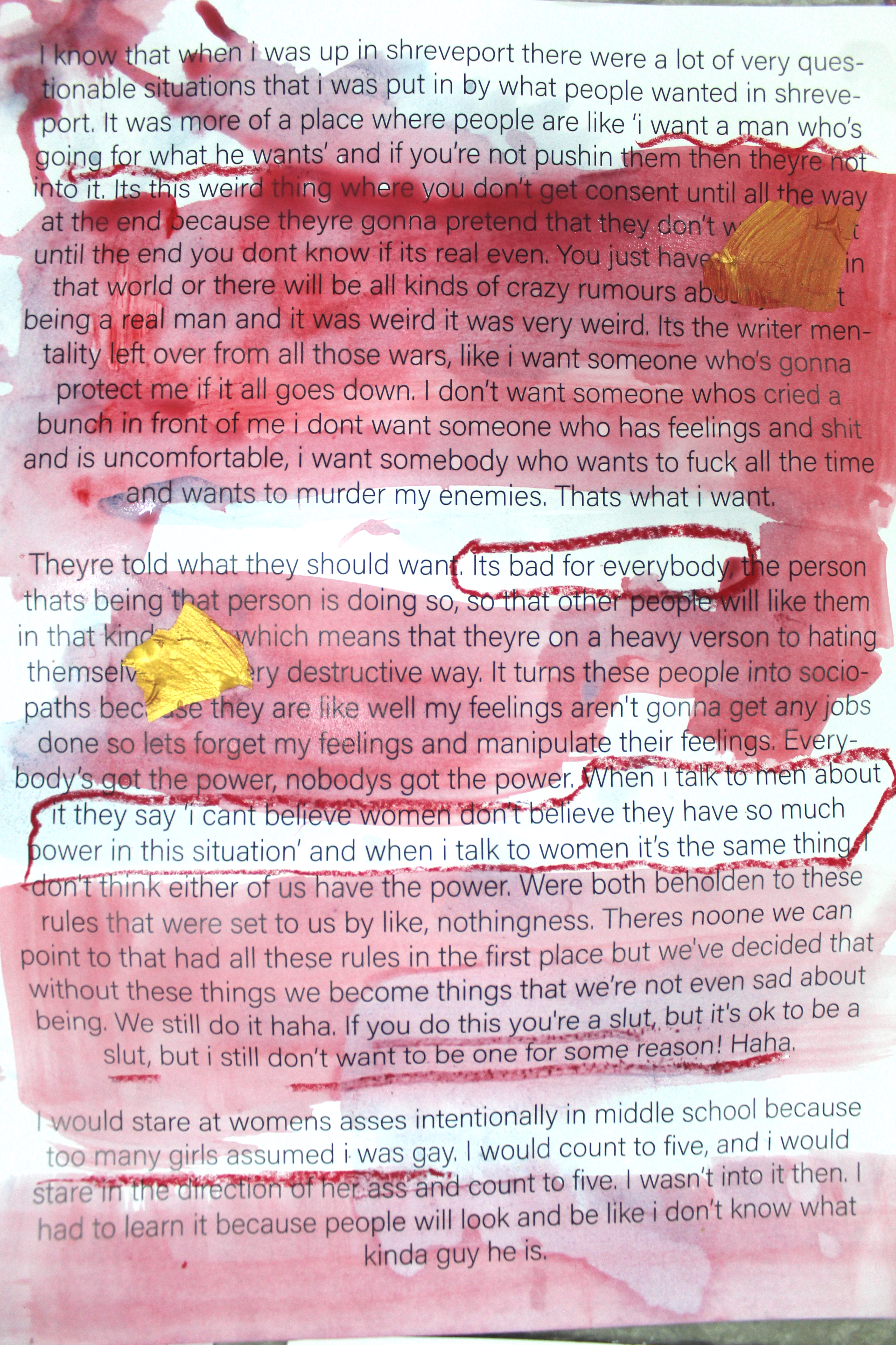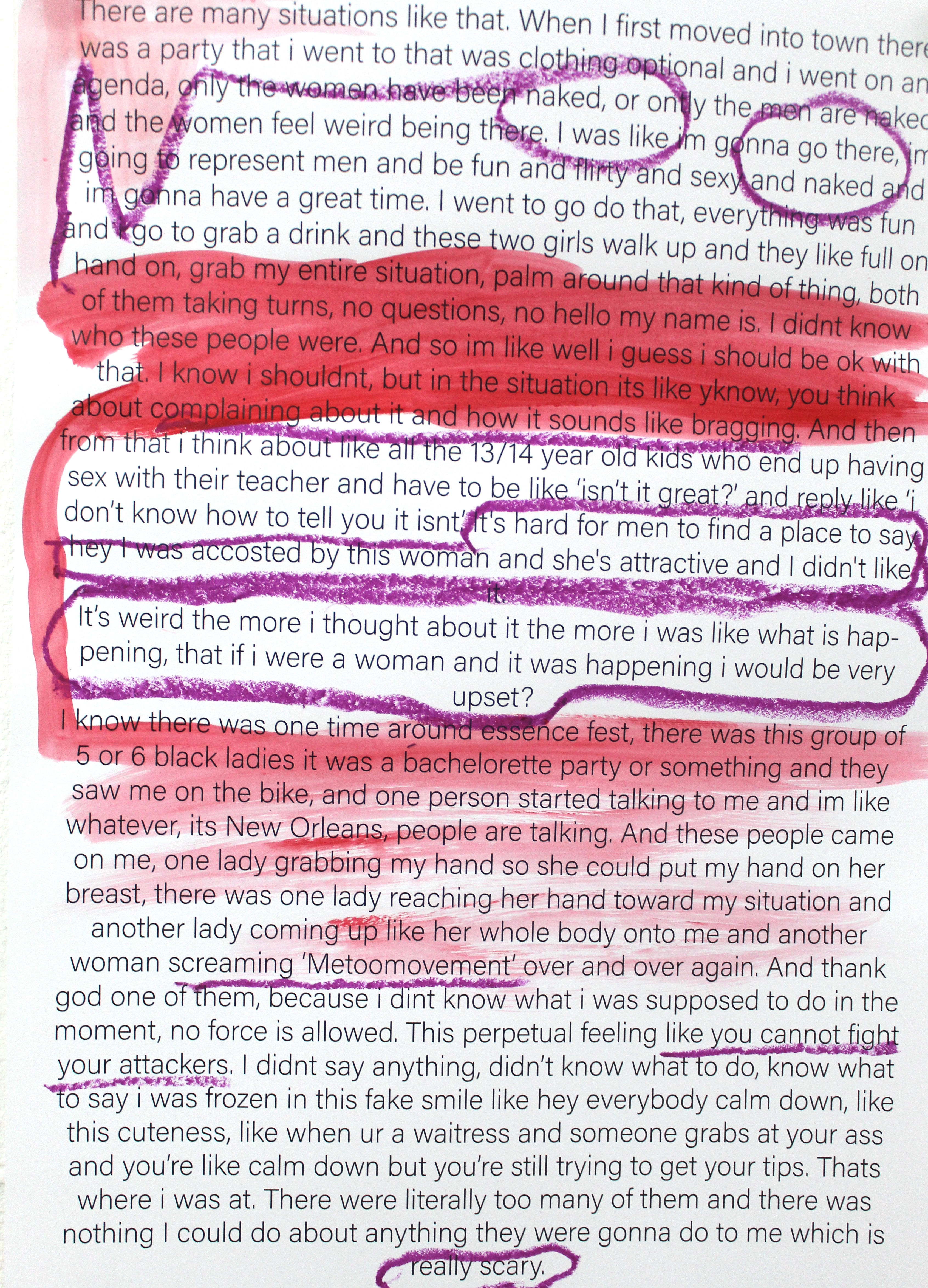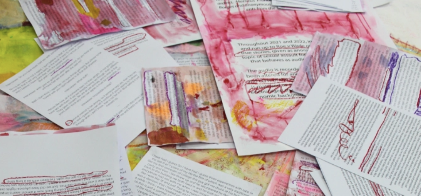 At it’s showing at GlogauAIR Berlin, verbal testimonies (recorded using actors) were played through ‘silent disco’ style headphones alongside two 9ft x 5ft double sided paintings which revealed snippets of the interviews that had been redacted after the end of the interview. 18 painted anonymous interviews and a video essay with over 50 pages of transcripts collected first hand explore the nuances of sexual trauma.